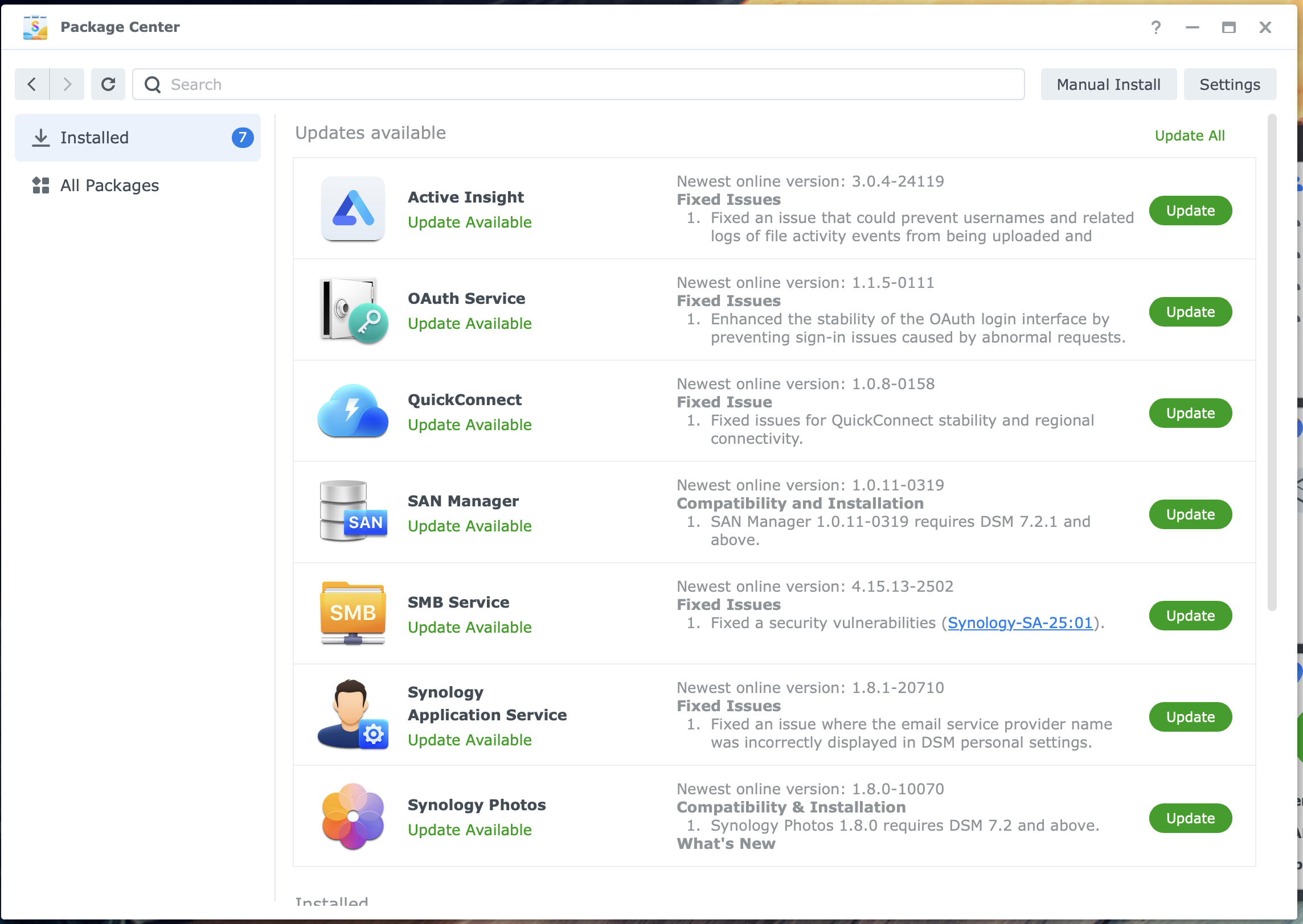 Synology is pretty regular in providing updates to their DSM as well as the apps. When you get a notification for the update, just log in as an admin, open the package center and run the Update All command.