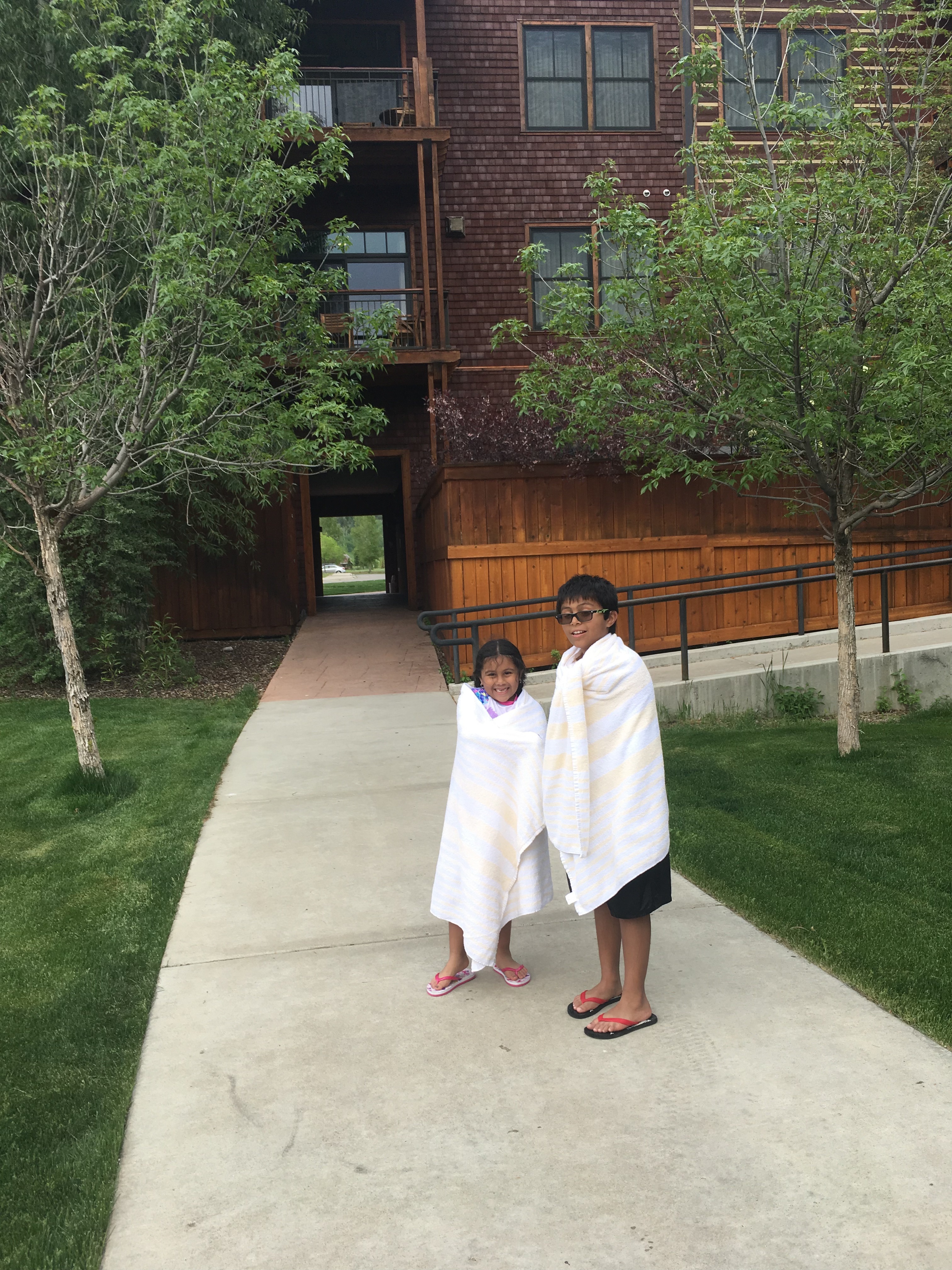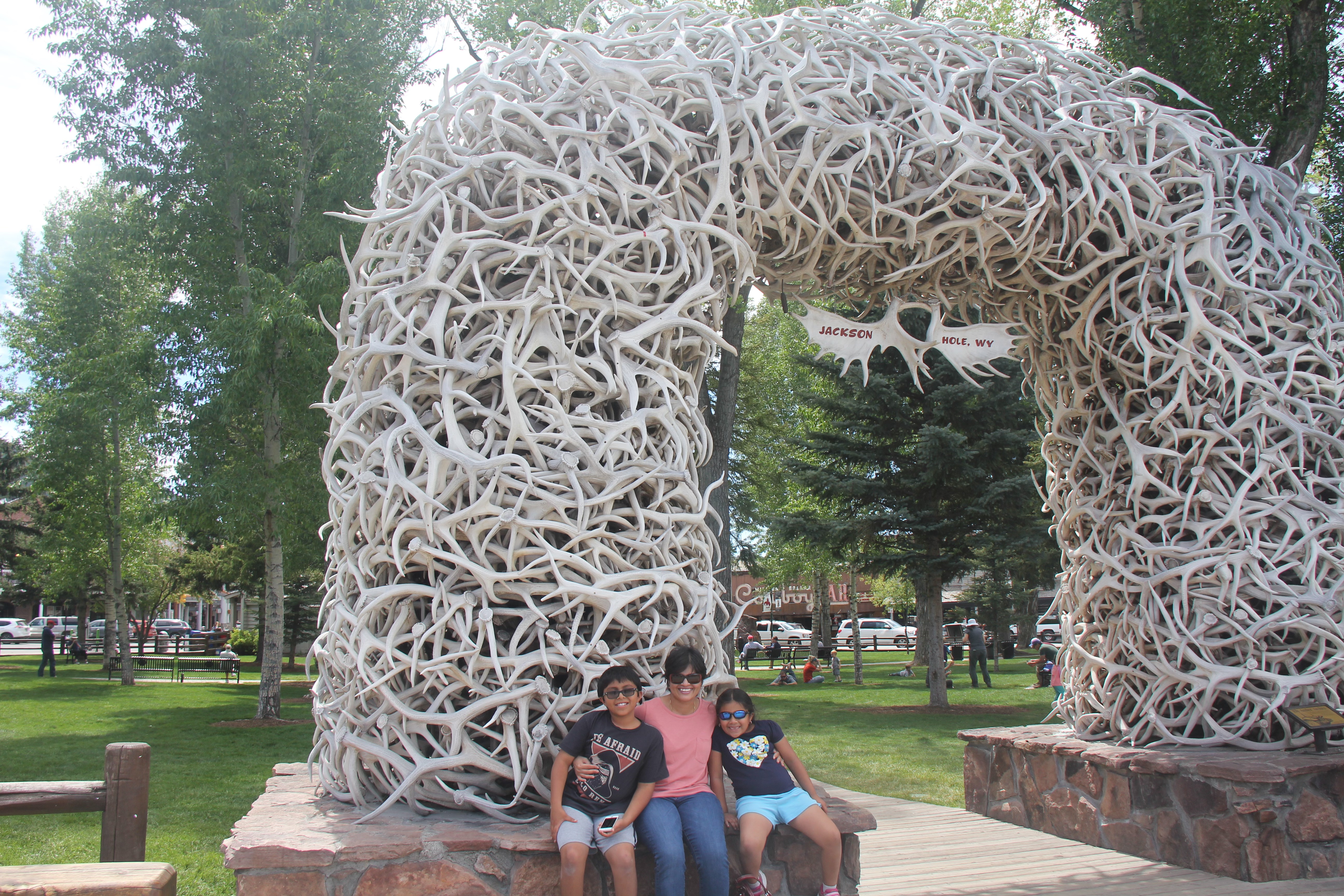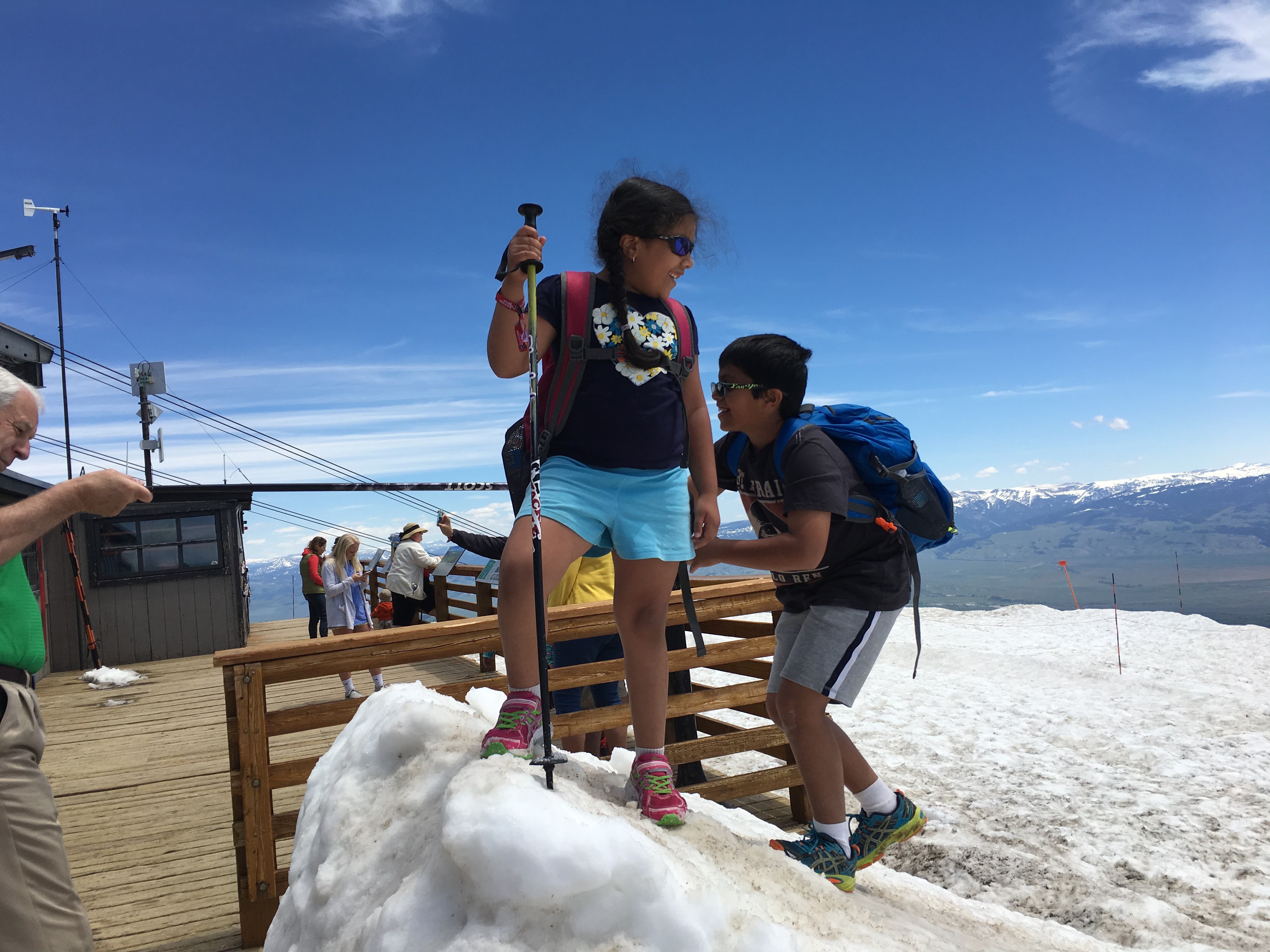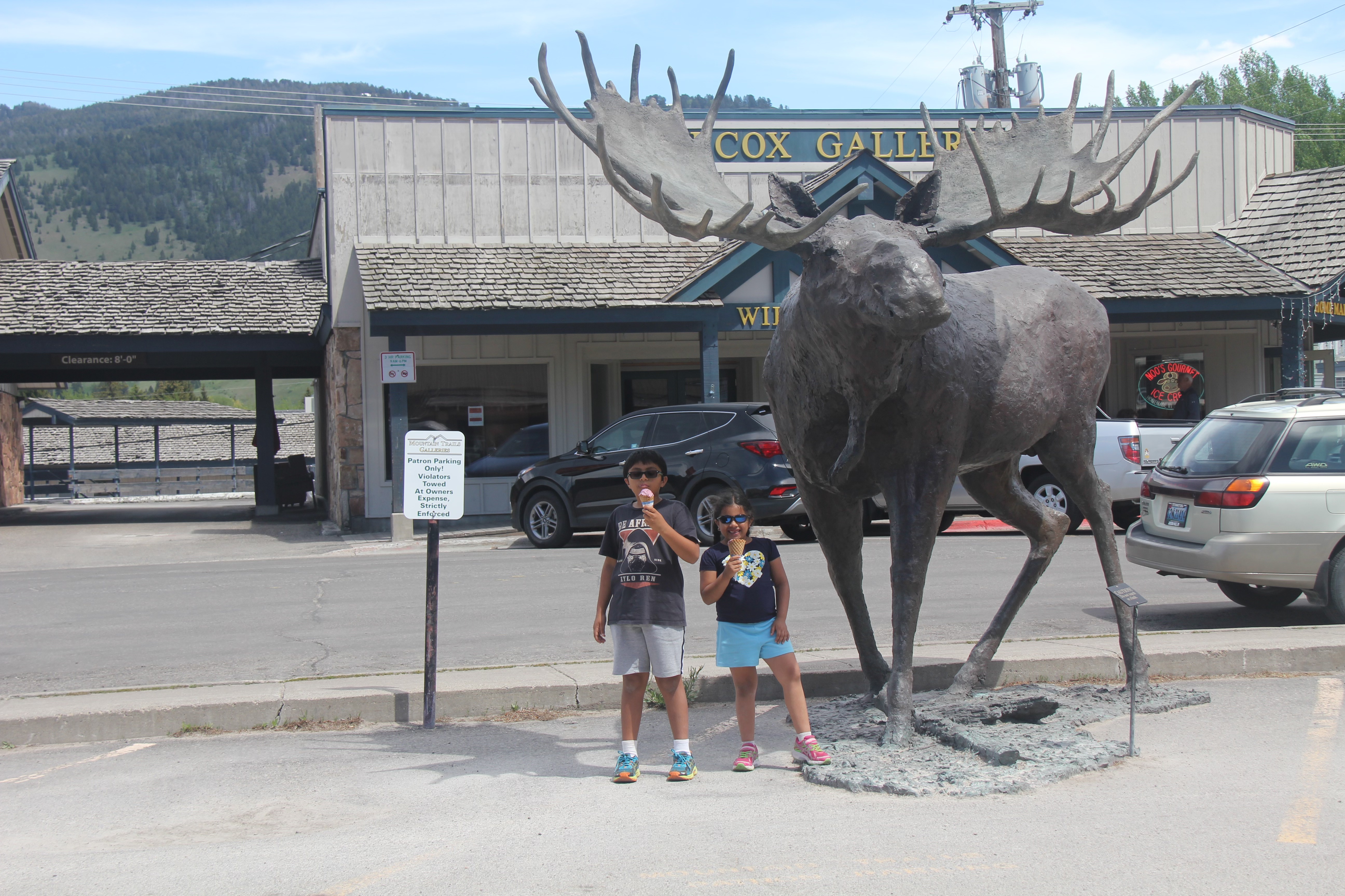 Day 1: June 3rd: Sat: Tram & Swim: We started our day with some cereal at the Teton Springs Lodge, and then drove down to Jackson hole, it was a 45 min drive. Grabbed brunch at Pearl Street Bagels, and headed to take a tram ride to Rendezvous peak. There was quite a bit of snow here. It was really fun for all of us. After the tram ride we walked around the Jackson Hole downtown, and admired the metal sculptures and the antler gateways at the park. Next up was getting some ice cream at Moo’s Homemade ice cream & Sorbet. Since our lodge had a pool, we figured, why don’t we get some swim clothes for all of us. We headed to a local K-Mart (yes they did exist here in 2017!) and picked up swim clothes. After that we headed back to the resort for some relaxation. It was fun. Wanting to keep some snacks available on hand, in case the kids wanted something to eat while on the drive, we headed to the Broulim’s grocery store and picked up some basics.