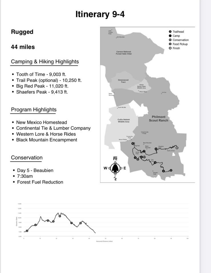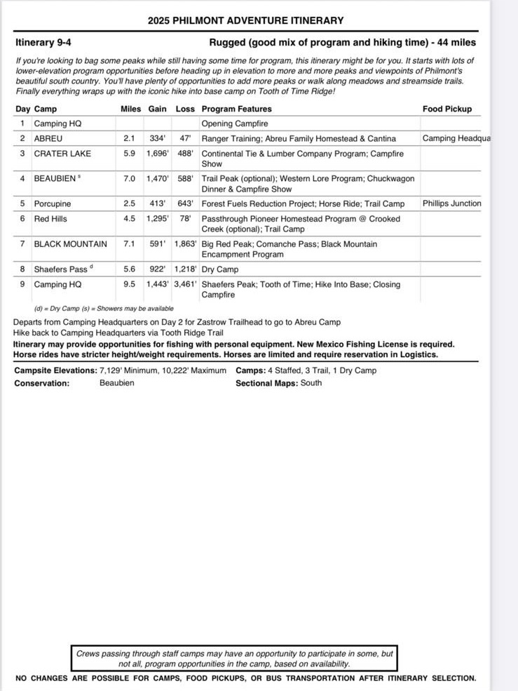For this Philmont trek, we decided to go on a Rugged Itinerary with optional summits at Trail Peak, and Black mountain. Horse riding at Beaubien was of high interest to the crew too.
