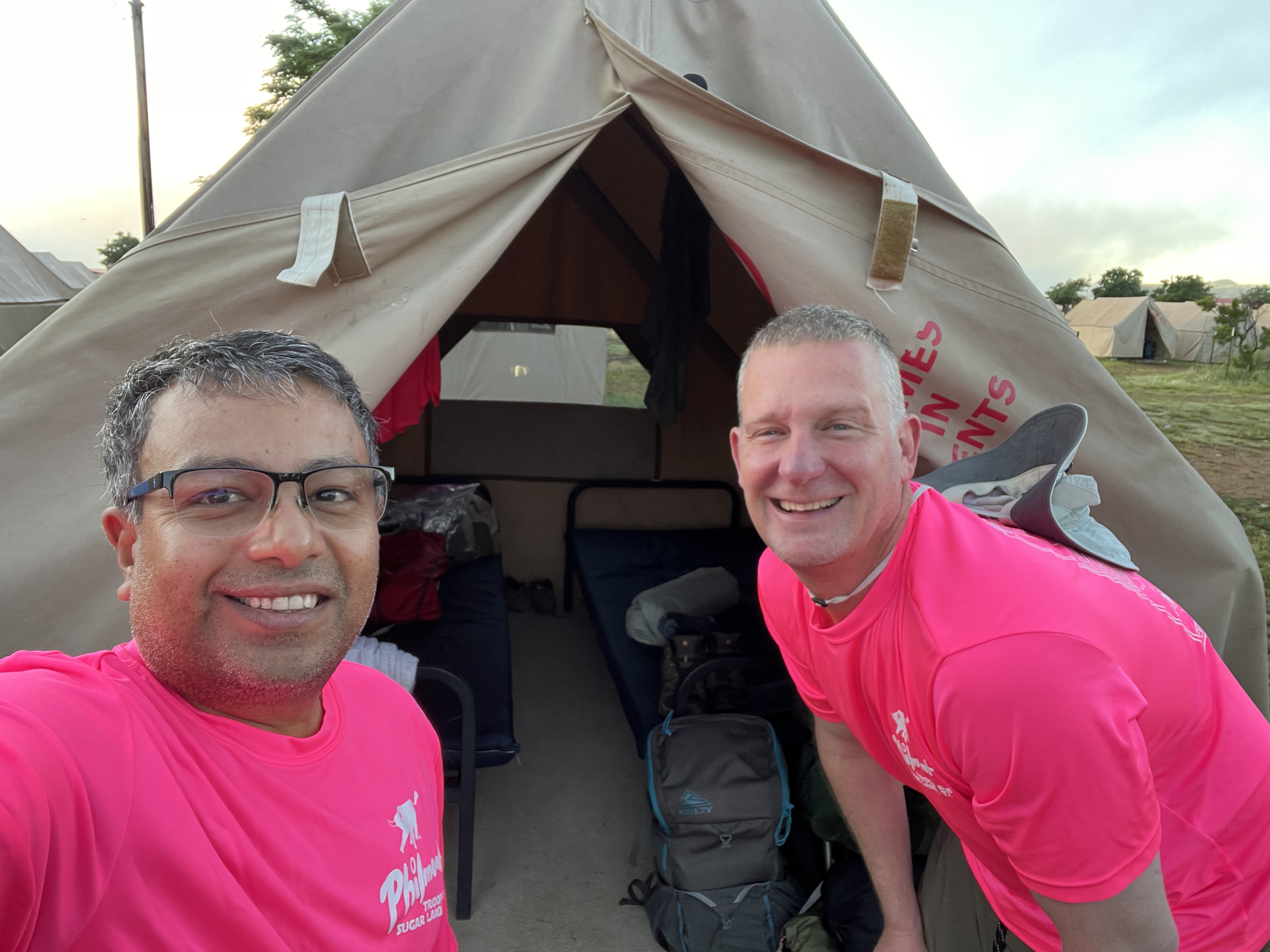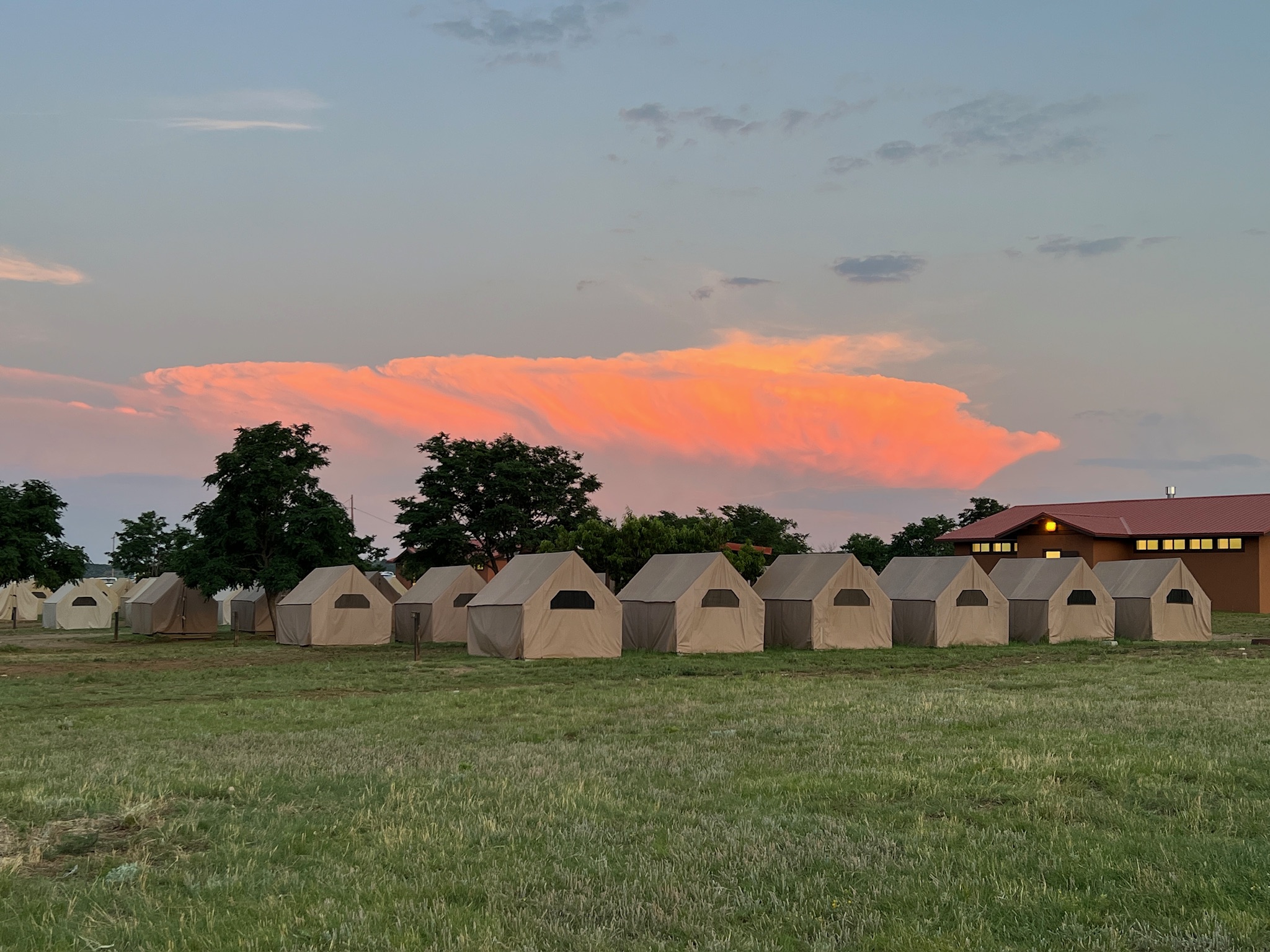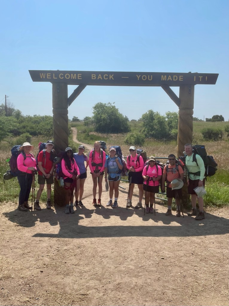 We woke up at 5:45AM, showered, got ready, headed to Buc-ee’s for breakfast, which was a breakfast burrito and a yogurt parfait. Katy took over driving, and we had Cristina navigating. We are going thru some verry sparsely populated countryside. Stopped at Love’s just on the border on NM for a pit stop. Now the final leg of this journey. We are driving past Urraca Mesa, Tooth of Time and other landmarks, and before we knew it, we were driving into Philmont. Once at Philmont, we got our stuff out, lined up our backpacks and are going thru orientation. Once orientation was completed, we were assigned tents to keep our stuff in. We need to get out by 8:30am.