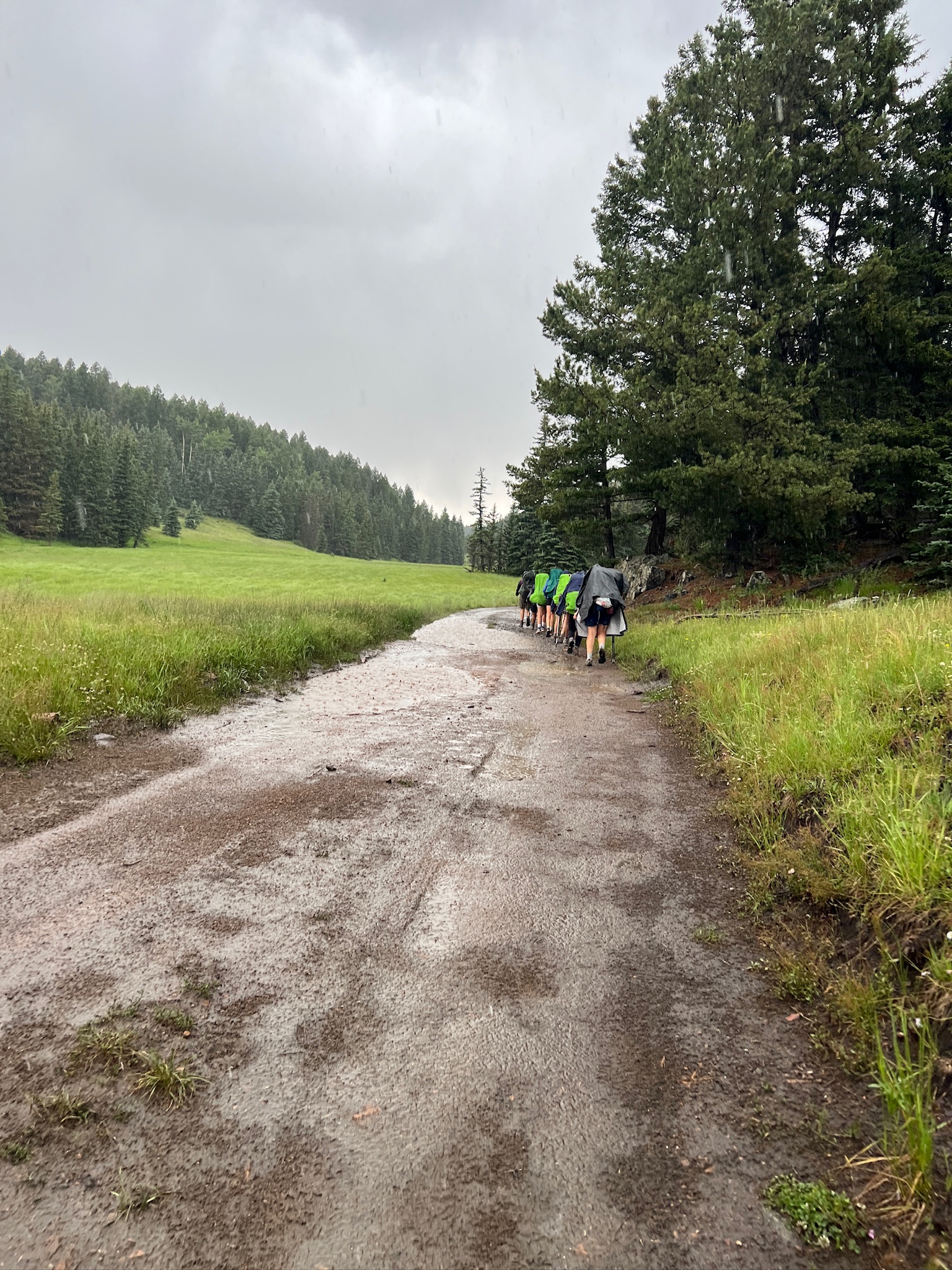 Half way down Trail Peak, it started to rain, and then we got some hail too. Hey, it’s all part of what is expected and what we prepared for, right? We quickly put on our raincoats, oh, now the rain stopped, it was warm, we took off our raincoats, oh, now it’s raining again, we put our raincoats back on! I’m really tired. The hike took us thru some really pretty scenery. Got off the trail and couldn’t locate the continuing trail to Beaubien, plus with the rain, we decided we would walk into camp using the service road. Not recommended, but we did it as a last resort. Finally got to Beaubien.