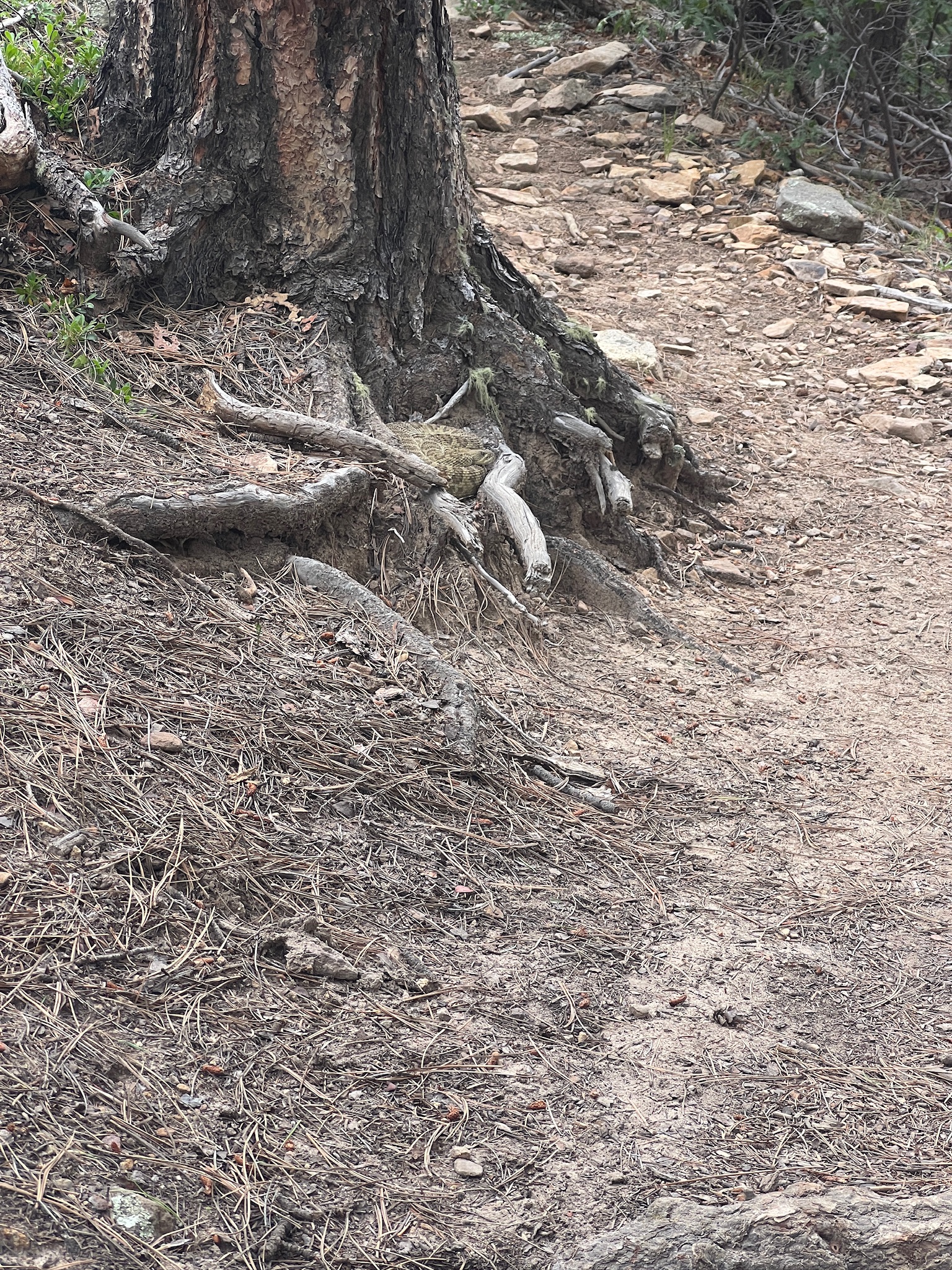 Woke up by 6am, packed, had dinner for breakfast, as Shaefer is a dry camp, and hiked out. We decided not to do the AM activity which would have either been blackpowder rifle or blacksmithing. The hike today took us along a creek. Lots of river crossings. We are keeping track, we are at 48 River crossings so far. It’s 1:05pm and we are stopped for lunch. I’m done with my lunch by 1:30pm, and am now getting the blisters on my left foot taped up. Also taped up my right shoe, which broke yesterday! Hiking on… filled water at 2:45pm. Had an interesting encounter at 3:21pm… see if you can spot it (image on the left).