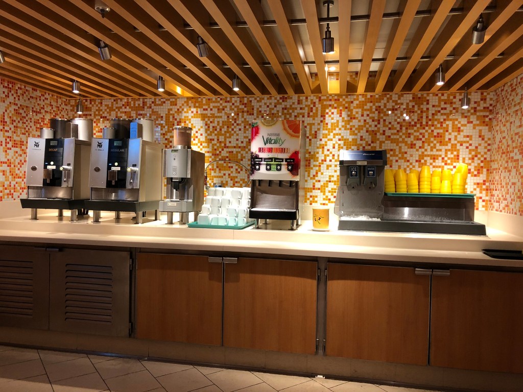 The food available on the cruise was outstanding. The food options included buffet, sit down dining, made to order burritos, 24 hour sandwich and pizza, lots of fruit and desserts. On the upper deck there was stations for coffee (regular and decaf), tea, lemonade and of course water and ice. And of course 24 hour frozen yogurt stations!