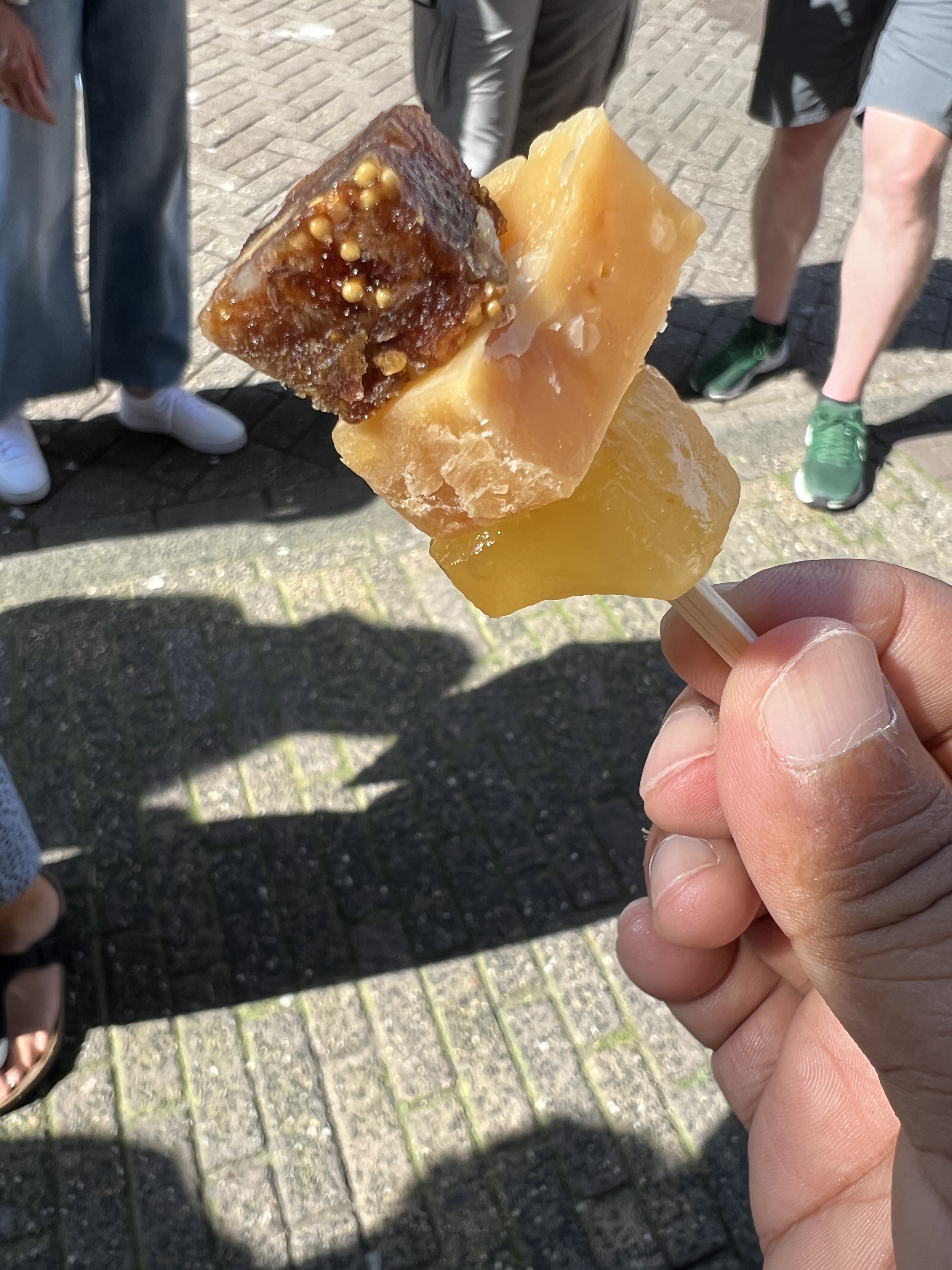 We then walked to the Lekkernijen Delli for some chese paired with wine. Starting with fresh cow Gouda cheese. Next fresh goat Gouda cheese. Wine. Candied ginger. Old Gouda cheese and top it off with Fig bread. Amazing!