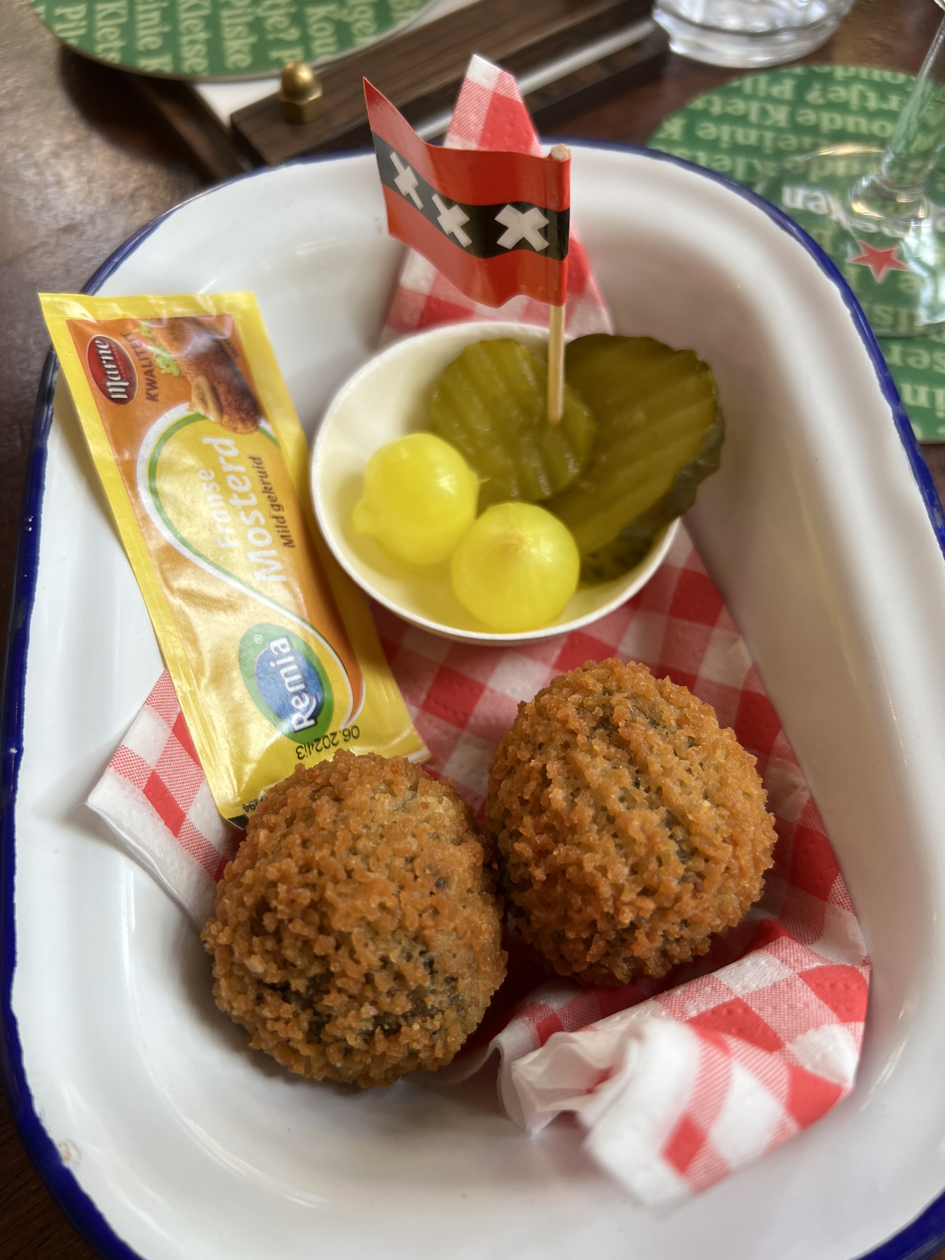 Next we went to the Cafe T-Smalle and had veg Bitterballen with a side of Hoppe. Bitterballen is a Dutch specialty, usually made with meat stew, but for us, they made a veg version with eggplant and mushrooms, that was equally impressive.