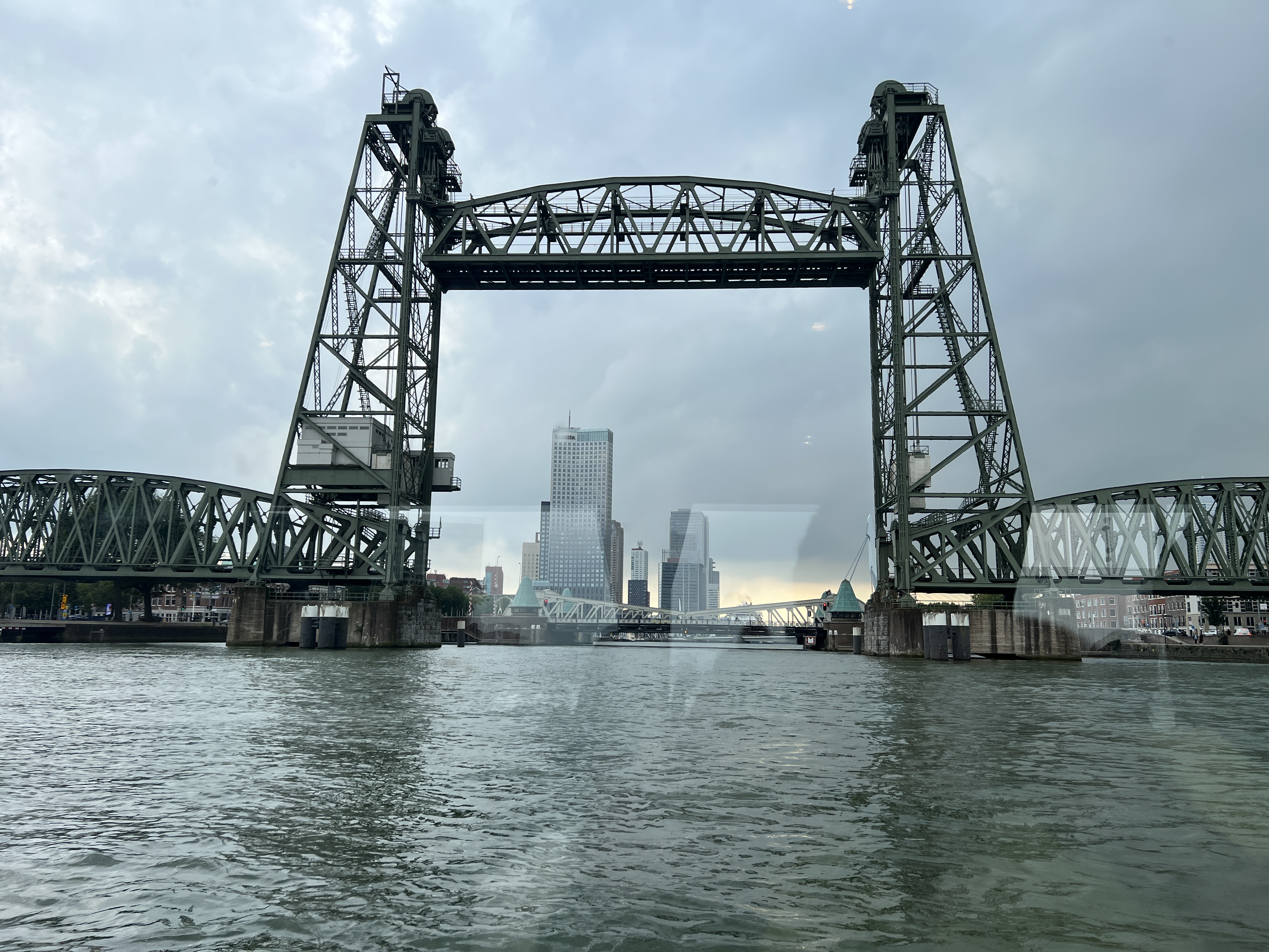 At Rotterdam. On the cruise boat. Having some apple pie and beer. It’s a one hour cruise, and we are enjoying the beautiful sights of the city. Towards the end he if the crew. It has started raining really hard. Luckily we are in a covered boat, so all good!