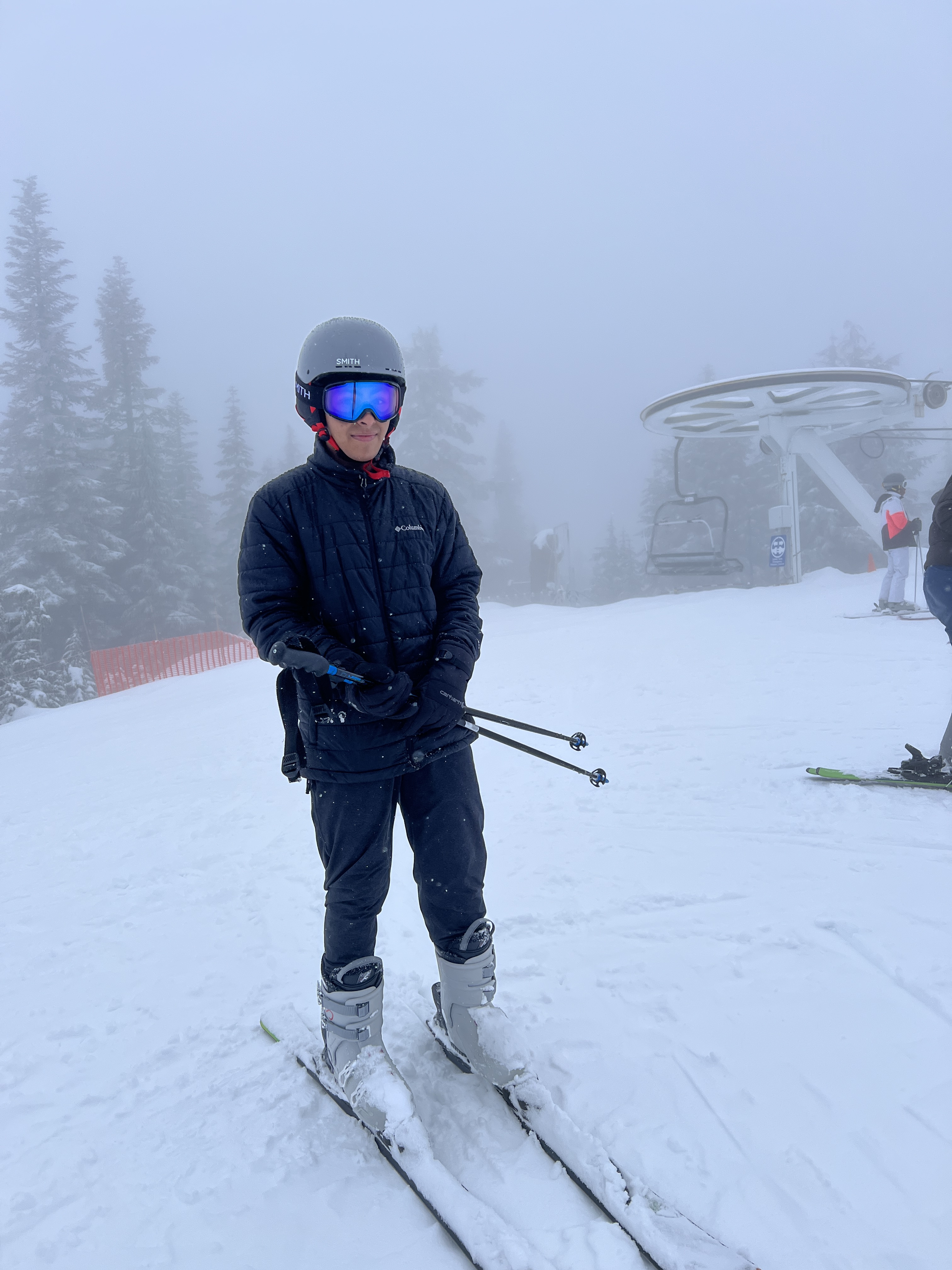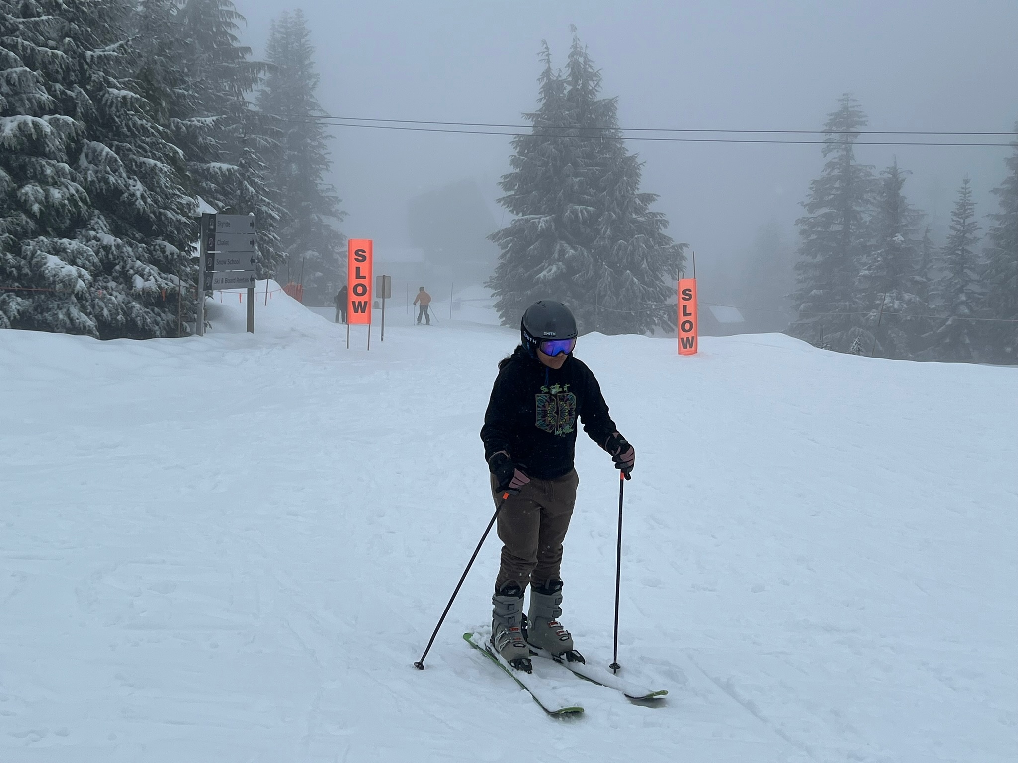 Woke up early, got ready, had bagels and tea for breakfast, and headed out to Grouse Mt which is 10 min from our Vrbo. Walked up to the counter and explained to the person, we had no clue what to do, but we wanted to go up the mountain and the kids wanted to Ski. He patiently explained to us what we needed. Basically, 2 gondola tickets for the adults, to get to the top and back, 2 gondola + ski lift tickets and we need to rent ski’s, ski boots, a helmet and the ski poles. We also had to purchase goggles and gloves, which are not rented out. That would take care of us for the day. With that purchased, we lined up to take the red gondola to the top of the mountain. It was a very scenic ride up, in spite of the slight drizzle and the cold temperature.